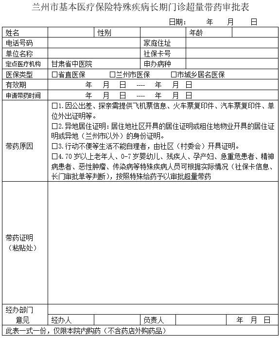 兰州市基本医疗保险特殊疾病长期门诊超量带药审批表