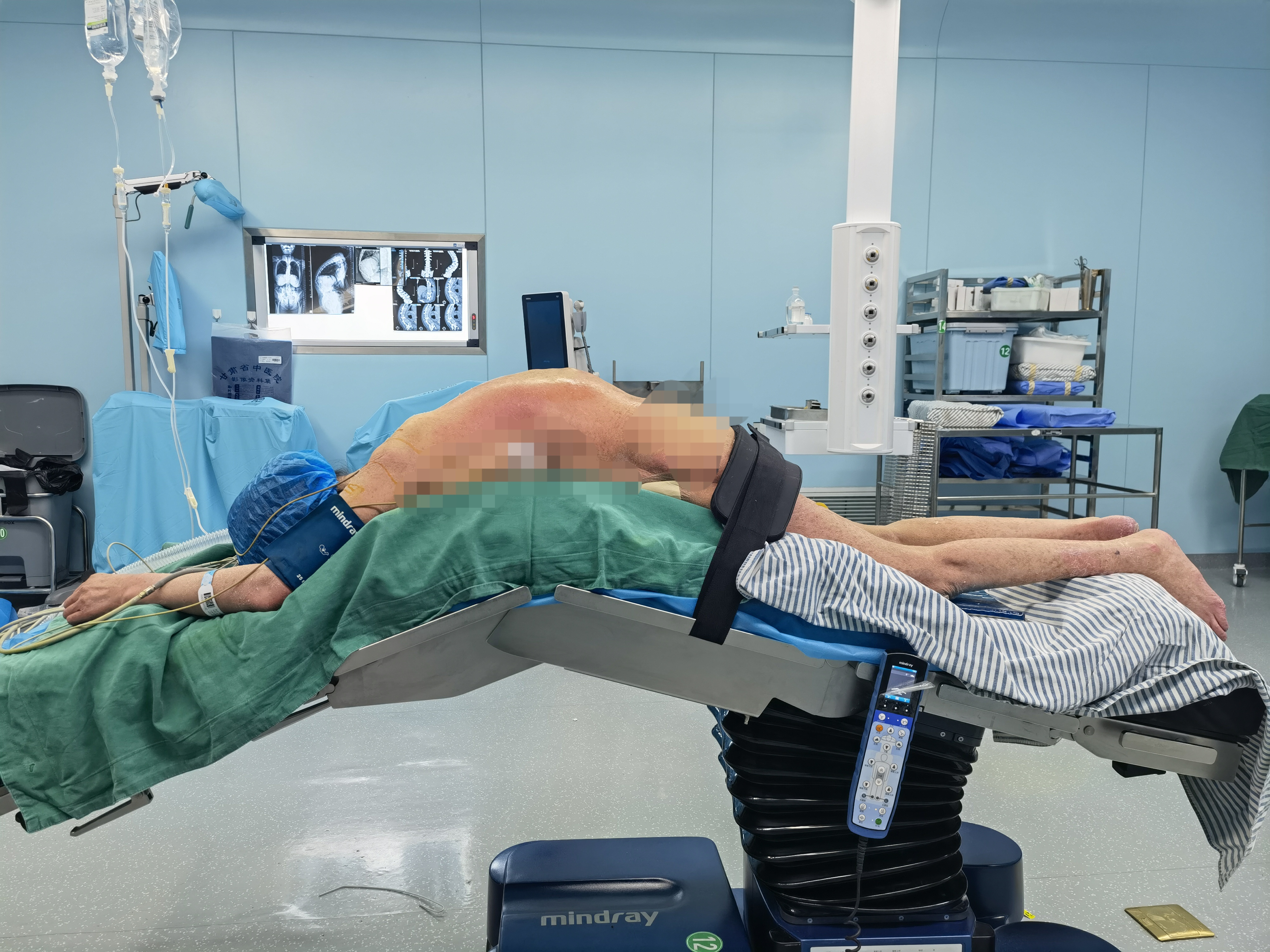 患者入院后完善检查,经李晨旭副主任医师、叶丙霖副主任医师等专家多次讨论手术方案,并请麻醉科、呼吸科、输血科等多学科术前充分评估后制订了严密的手术方案,在相关科室的大力支持和配合下,由李晨旭副主任医师主刀在全麻下行改良PSO截骨矫形术。