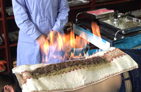 艾姜火龙灸是根据病情的需要,将中药打粉、生姜泥相拌,并在姜泥上置于艾绒后,喷洒酒精进行施治,不同部位,可采用