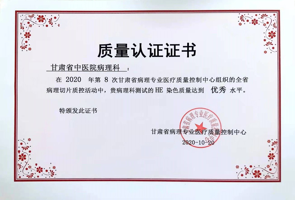 近日,我院病理科在2020年底第8次甘肃省病理专业医疗质量控制中心组织德全省免疫组化切片质控活动中,我院病理科测试德CD56、Ckpan、Her-2、Ki-67、HE染色质量达到优秀水平。