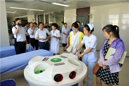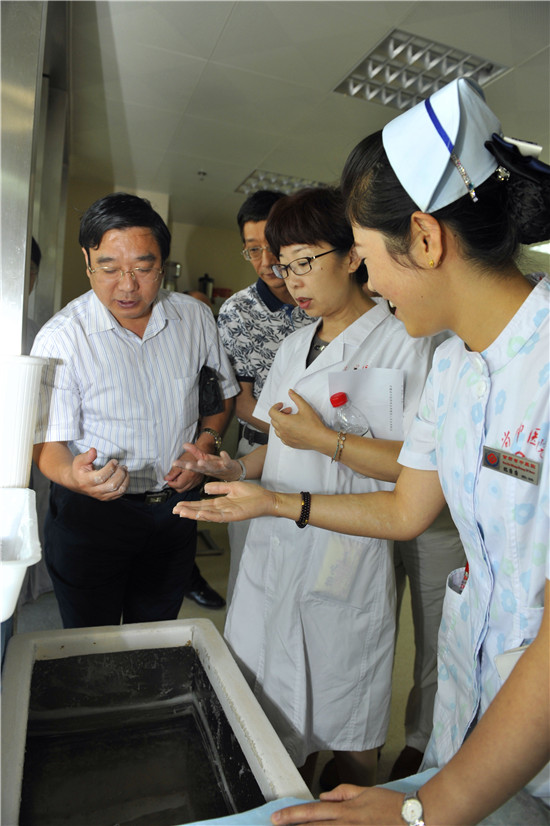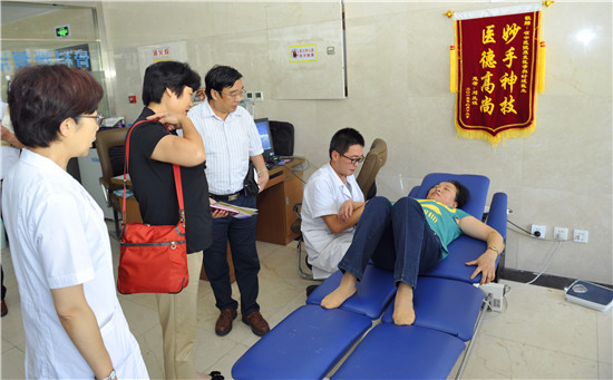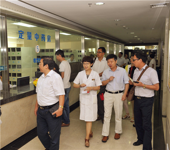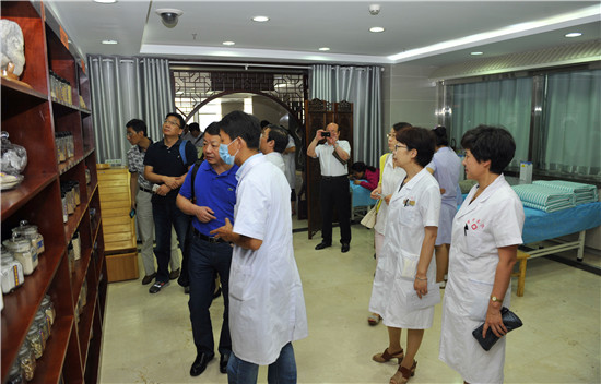 舒院长陪同来宾参观了名医馆、外治科、风湿骨病科、针推科、康复科、药学部、门诊大厅,观摩了蜂疗、蜡疗等中医药特色疗法。