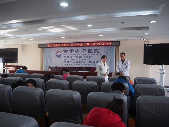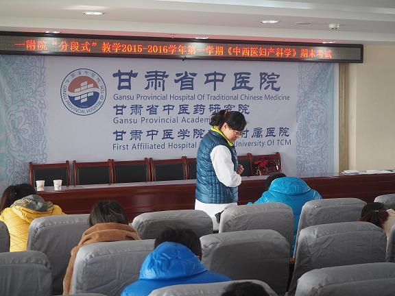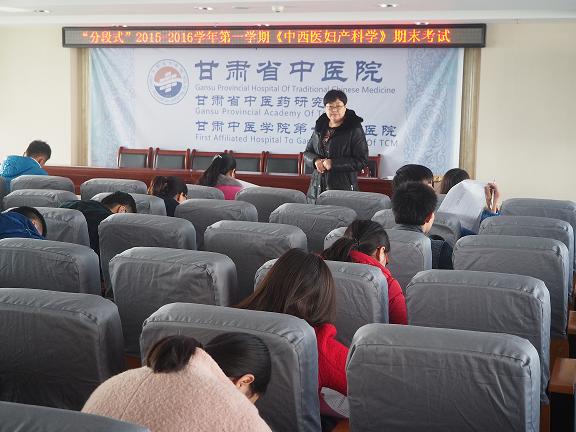 2016年1月13日、14日,临床教学部根据甘肃中医学院中西医结合学院《关于分段式教学专业年级2015-2016学年第一学期期末考试安排的通知》(中西医结合学院发[2015]14号)文件通知,与学院同步组织“分段式”教学考试。59名“分段式”学生在医院A座17楼学术报告厅进行期末考试。