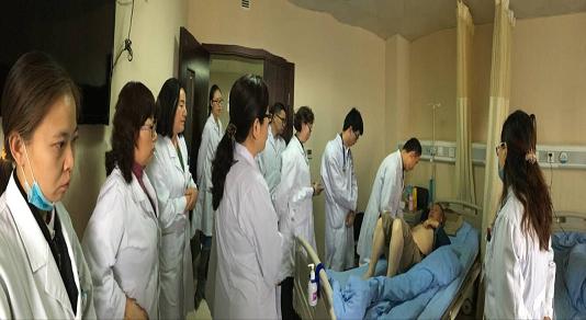 肿瘤科、血液病一部选择一例中医诊断内科癌病(痰湿阻滞),西医诊断肾恶性肿瘤术后、肺继发恶性肿瘤术后、高血压2级高危组的病例作为教学病例,教学查房教师为肿瘤、血液病一部倪红主任医师,甘肃中医药大学中本专业实习生李文华汇报病史,主治医师彭海平补充病史。在病房,实习生李文华做专科查体,主治医师彭海平对学生腹部查体做示范指导,主任医师倪红总结学生的查体并补充不足。