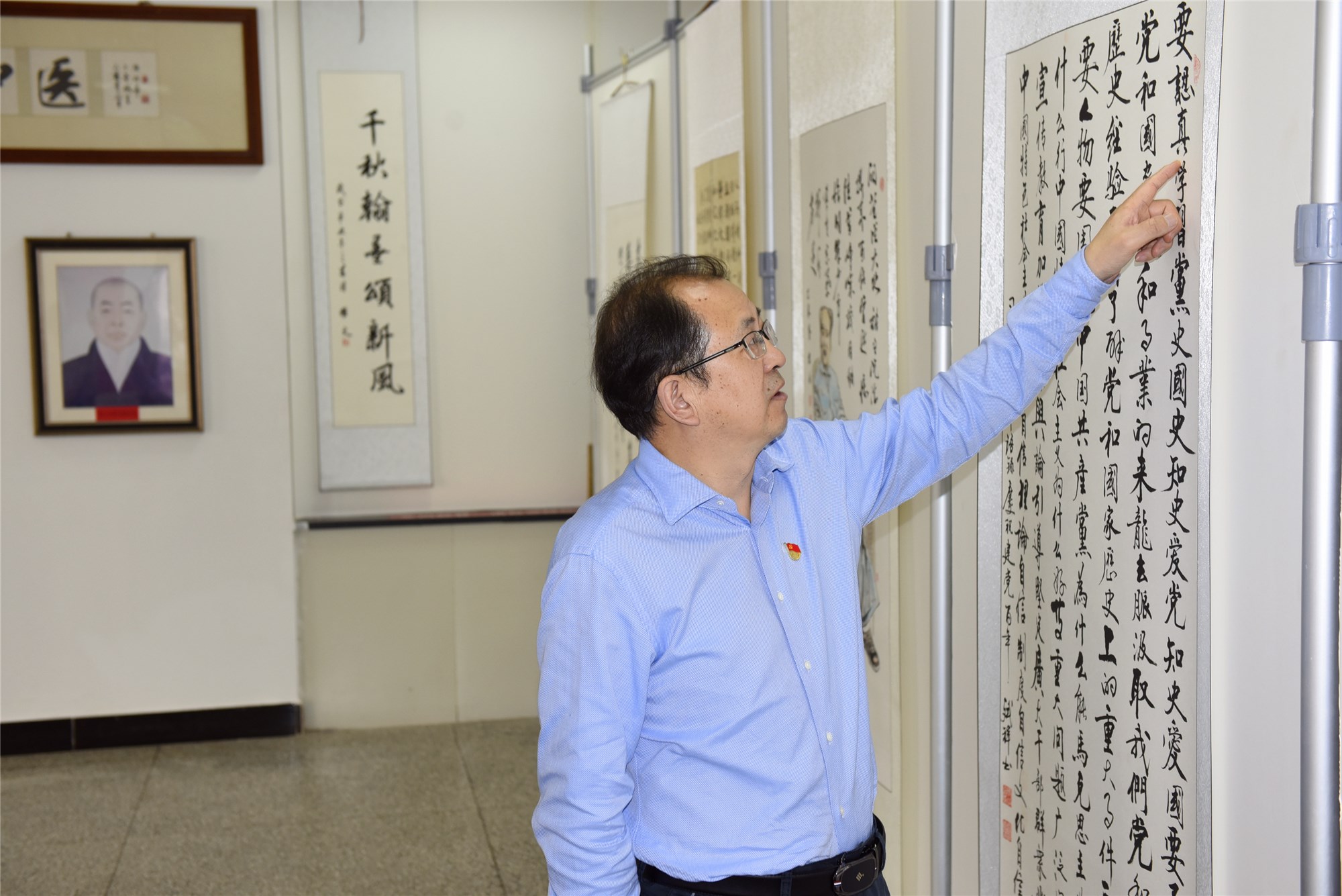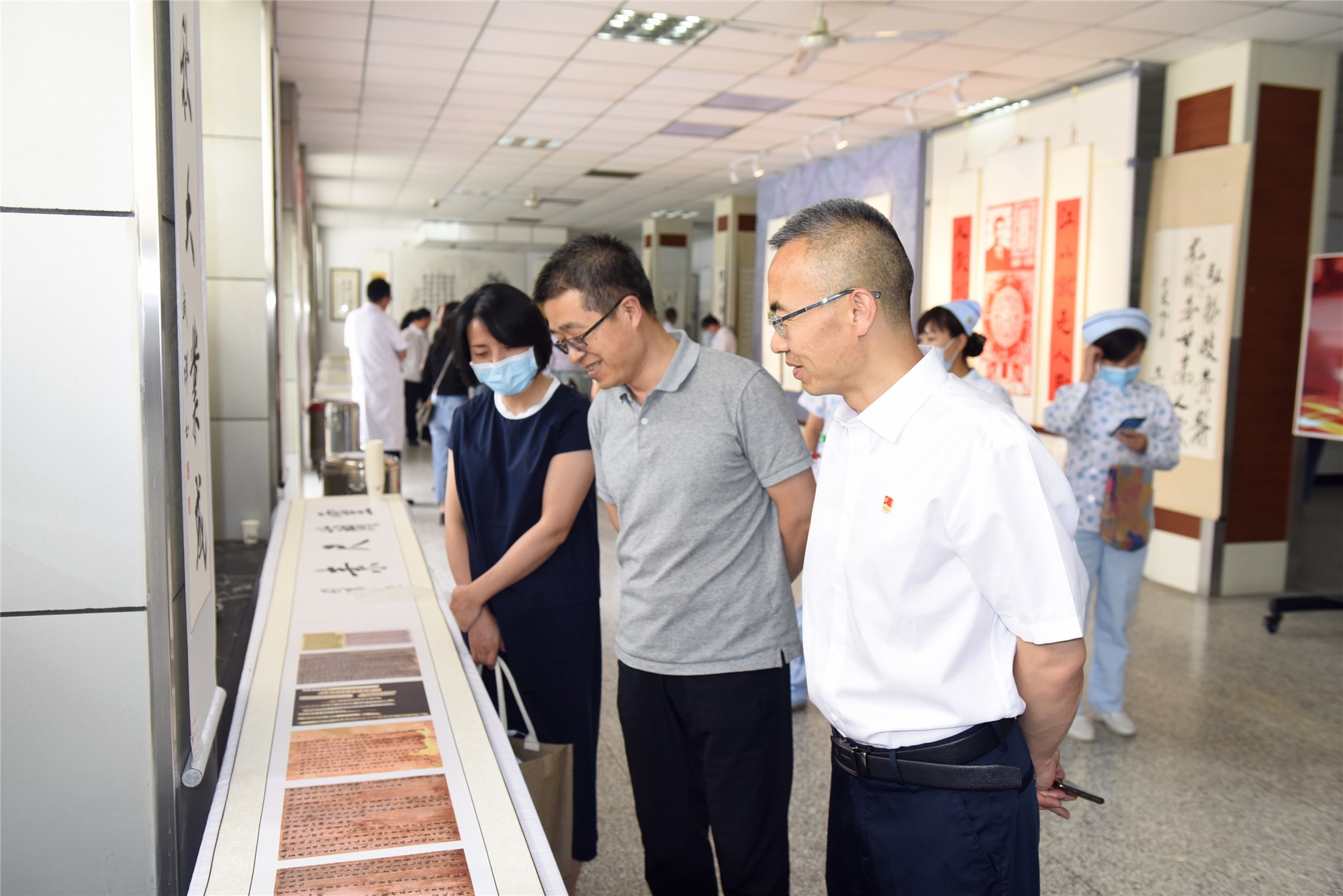 此次展览由医院党委办公室、院长办公室、院史办公室、纪委办公室和宣传处共同承办。医院各党总支、各支部组织80多名党员和干部职工及书画爱好者参加开幕式并现场观看展览。