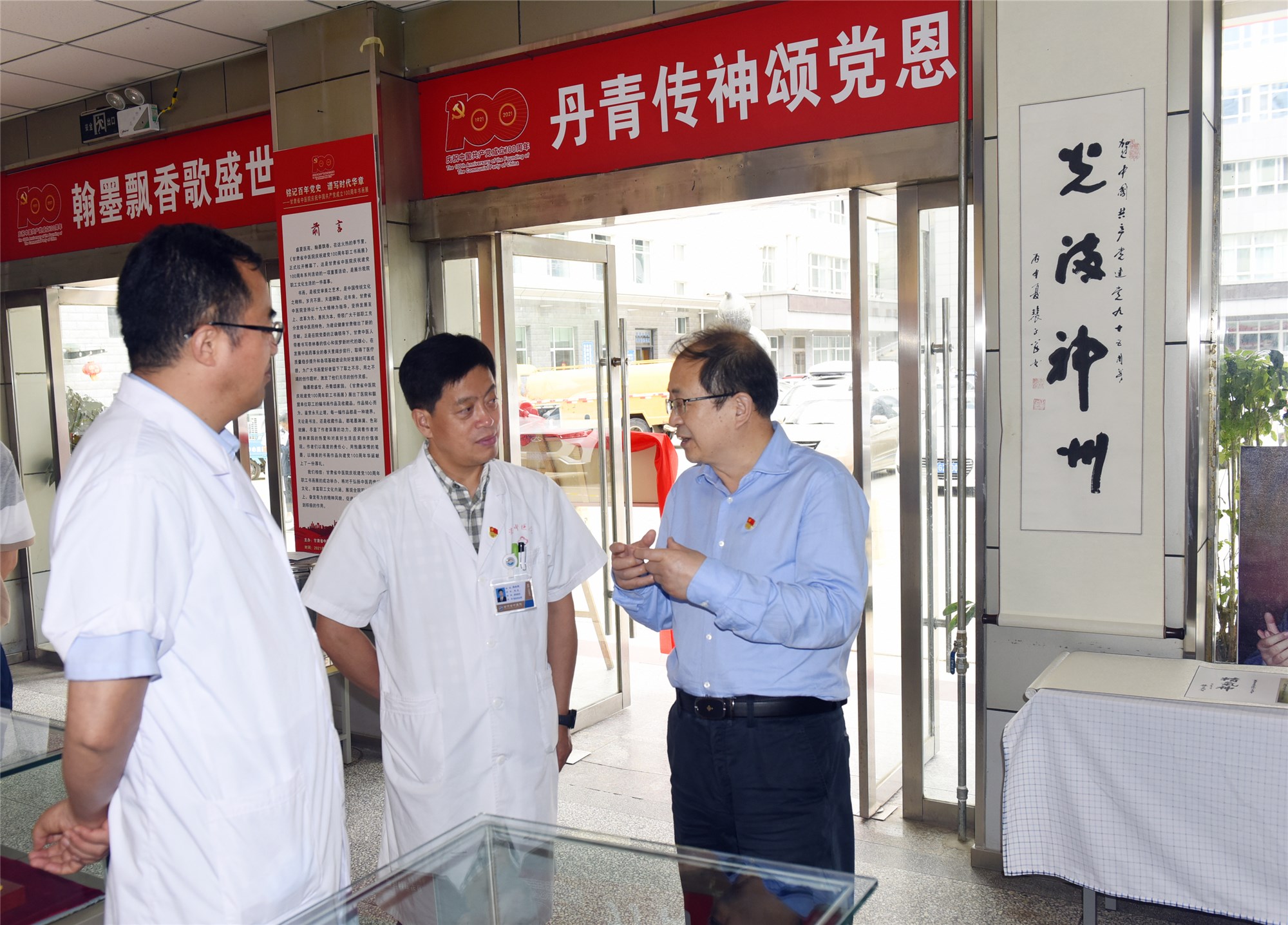 翰墨飘香歌盛世,丹青传神颂党恩。6月18日,以“铭记百年党史,书写时代华章”为主题的甘肃省中医院庆祝中国共产党成立100周年书画展在医院东院区开展。活动以艺术展览的方式,追寻中国共产党的百年岁月,讴歌党波澜壮阔的百年辉煌和伟大成就,为党的百年华诞献上美好的祝福。省卫健委党组书记杨陇军观看展览并对此次展览给予充分肯定。他说,甘肃省中医院文化丰厚,人才辈出,应该很好地发掘整理。这次书画展,既是一个很好的党史学习教育课堂,也是一场视觉与文化相融合的艺术展示,对于推动医院文化发展、营造建党百年浓厚氛围起到积极作用。医院党委书记郭峰、院长赵继荣为书画展揭幕,党委副书记、副院长马忠祥主持开幕仪式,党委委员、纪委书记李小平、省中医药研究院党总支书记张强出席开幕仪式。