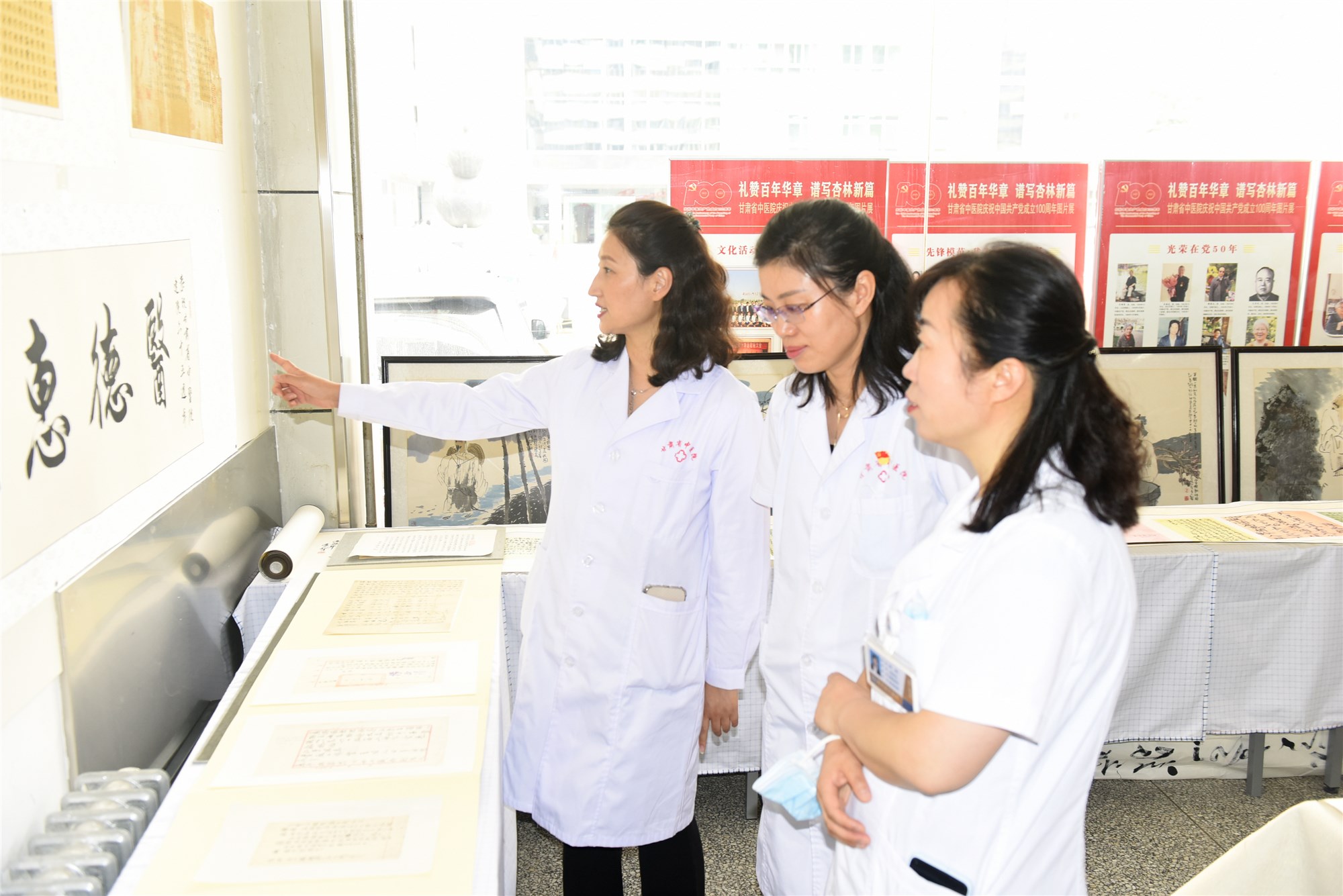 此次书画展展出作品110余件,主要包括受邀书画家的作品,医院职工的书画创作和收藏以及珍贵的文档资料,还有全国先进工作者、全国抗震救灾模范、全国疫情防控工作先进个人、光荣在党50 年等荣誉徽章等实物资料。主要以庆祝建党100周年为主题,以书法、绘画、剪纸、篆刻等多种艺术形式讴歌党的光辉历史,展示博大的中医文化和丰厚的院史资料等。此次展览从不同角度,抒发了广大职工对党、对新中国、对改革开放、对新时代的挚爱之情。20多名中国书法家协会的会员、理事和甘肃省名老中医为此次展览题赠作品,60多名医院职工提交书画创作或个人收藏,通渭县中医院、白银市中西医结合医院、庄浪县南湖中心卫生院等甘肃省中医院联盟单位和专科联盟单位选送作品参展。