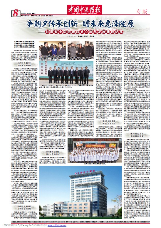 60年春秋相依,60年砥砺奋进,60年欣欣向荣。从 1953年12月8日甘肃省人民政府卫生厅中医门诊部宣告正式成立至今,甘肃省中医院用一个甲子的发展铸就了一座甘肃中医药发展的历史丰碑,甘肃省中医院用60年的光辉岁月谱写着它治病救人的仁医之歌。