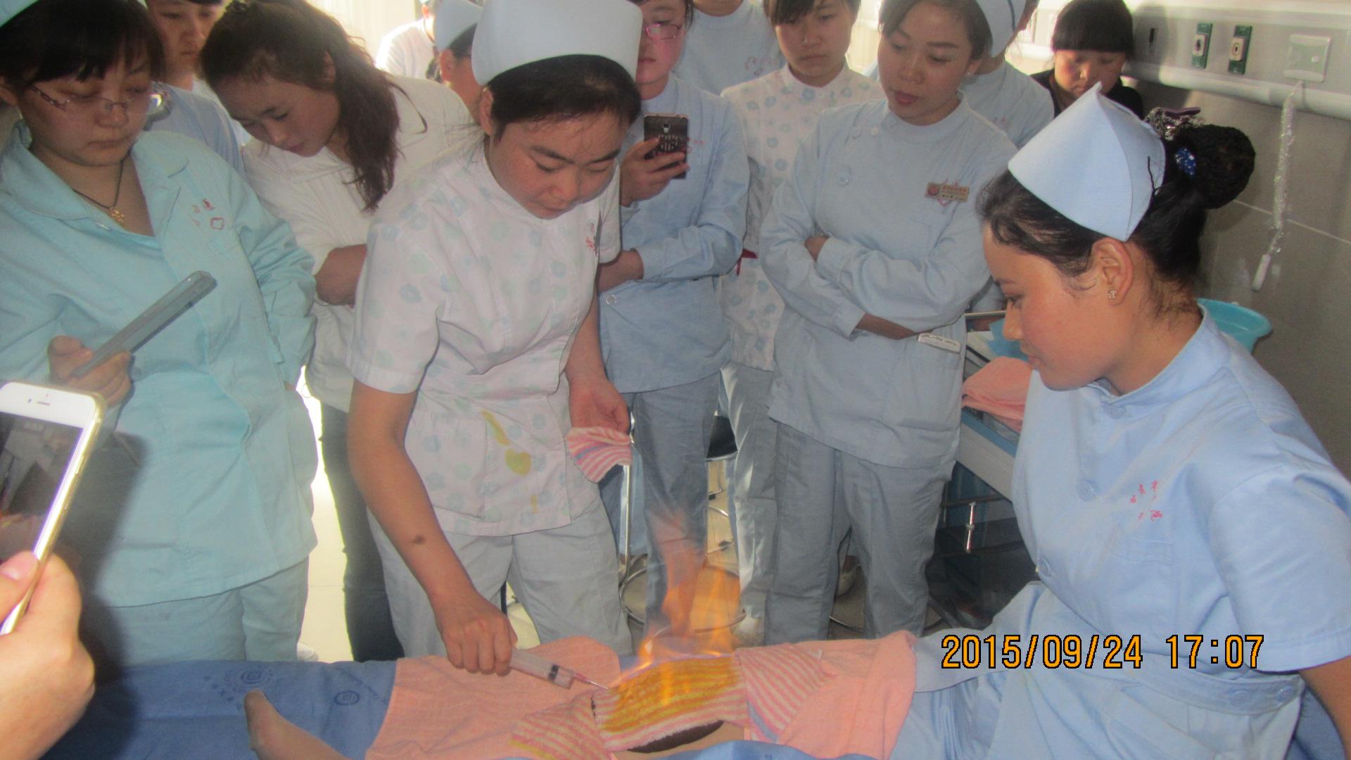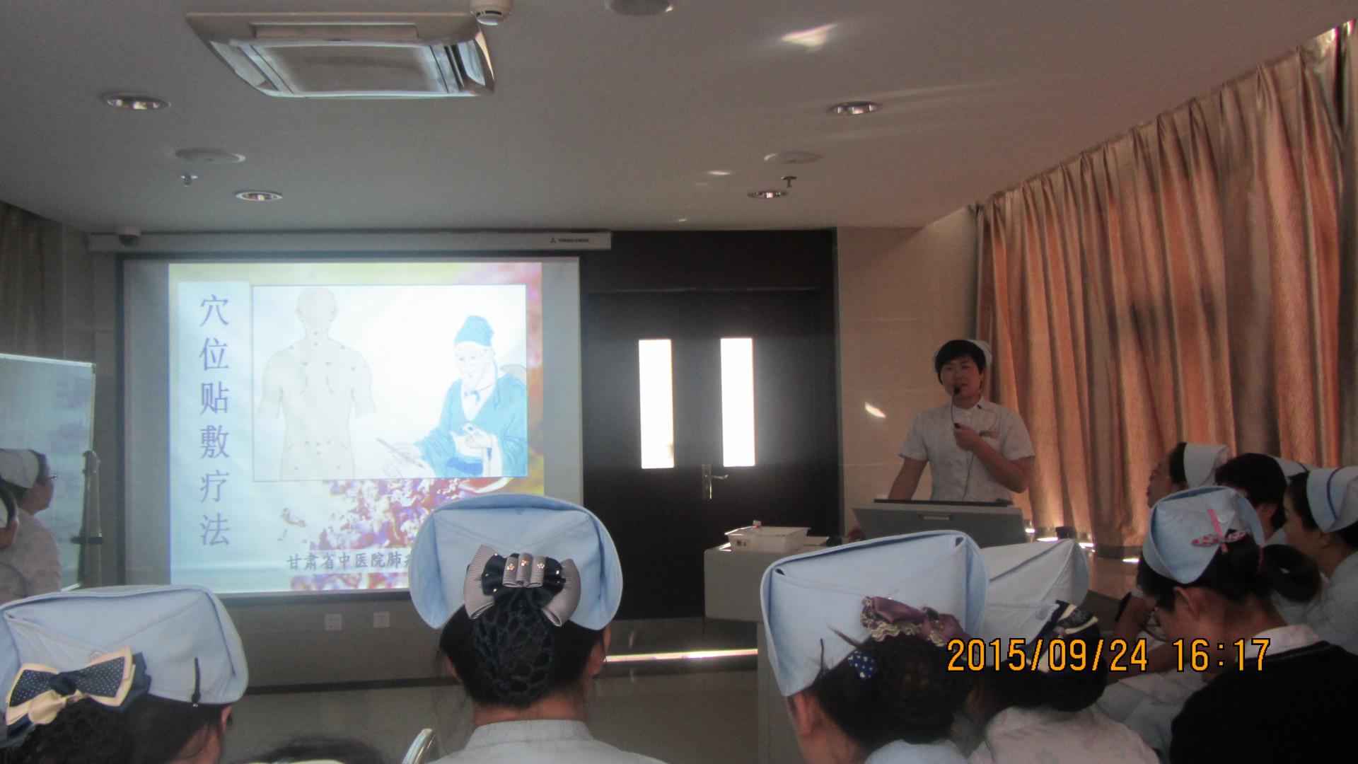 9月24日下午,为进一步规范我院中医特色治疗,普及中医特色治疗,提高患者治疗满意度,扩大社会效应,由护理部副主任张丽平和主任护师郭秀珍主持,中医特色治疗培训小组在A座17楼护理示教室对我院各科室操作培训员进行了艾灸、火龙疗法、穴位贴敷的强化培训。