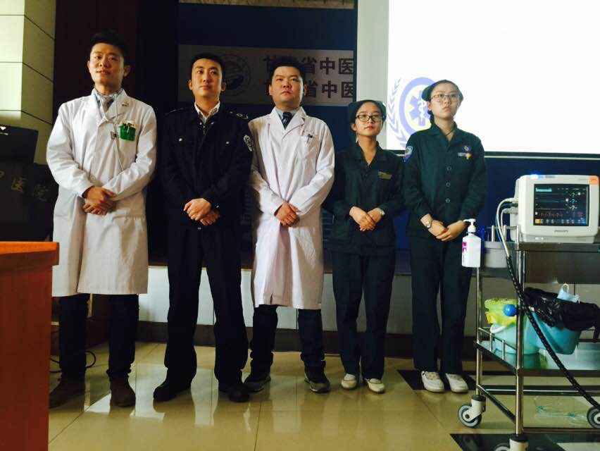 随后由急救中心医护团队现场演示抢救患者五人配合法、脊柱骨折患者搬运法。抢救过程涵盖了测量生命体征、建立静脉通路、执行给药医嘱、吸氧、心电监护仪的使用、除颤仪除颤、气管插管、心肺复苏术等技术操作。