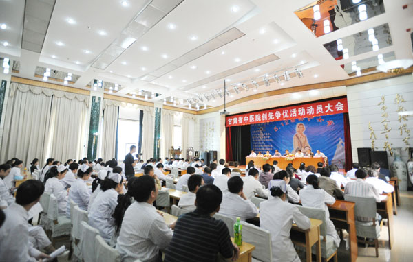 2010年5月12日下午,甘肃省中医院党委召开创先争优活动动员大会,对深入开展创建先进基层党组织、争当优秀共产党员活动作出全面部署和大会动员。党委书记妥建福作动员讲话,院长李盛华主持会议,党委副书记孙援朝宣读了医院的实施方案,副院长冯守文传达了中央和省委关于开展创先争优活动有关文件精神以及卫生厅系统创先争优活动动员大会精神;医院全体党员及护士长以上干部300多人参加会议。