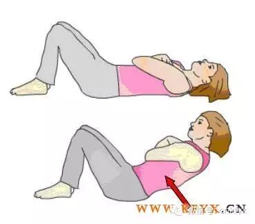 2. 双手在胸前交叉,保证你整个后背贴在地面上。将头及肩部稍稍抬离地面,缓慢抬高直至肩完全离开地面。刚开始抬的高度有限也没关系;