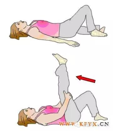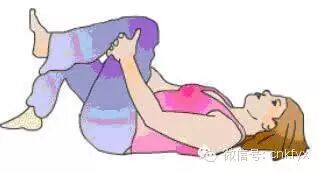 2. 两手抱住屈曲的膝,向上拉伸至胸部,动作连贯,同时你的下腰部及另一个膝紧贴地面;