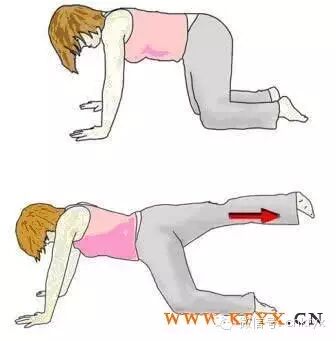 2. 缓慢将一只腿平行于地面后伸。脚可以伸直或者弯着,只要你觉得舒服。注意在你后伸腿的时候,不要让你的腰部、头或者腹部下垂。做这个动作的时候,要确保你身后没有人以防踢伤。