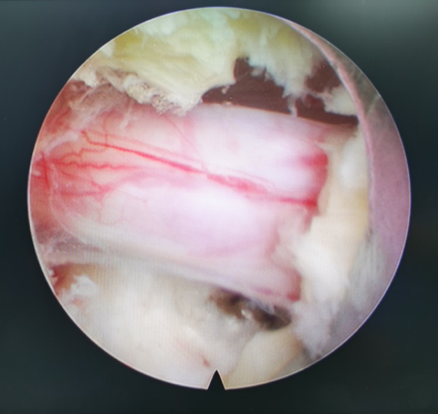 随着脊柱外科技术的不断发展,人们认识到在尽可能减少手术创伤的基础上,保持脊柱的完整性和稳定性、减少术后并发症,是当前治疗脊柱疾病的研究方向。经皮脊柱内镜技术是近年来应用于临床治疗腰椎间盘突出症等疾患的微创手术,通过带工作通道的内窥镜在生理盐水持续灌洗下进行操作,可在内镜视野下切除病变椎间盘,故又称为全内镜技术。病人在麻醉状态下,以7毫米的切口处将内窥镜放置到椎间盘突出部位,在内窥镜放大监视下,更清楚的看清解剖结构,用专用手术器械摘除突出的椎间盘组织并处理纤维环,直接解除神经压迫,术中医生即可评价治疗效果。该手术不仅创伤小、时间短、出血少等优点,而且术后恢复效果明显。真正达到了“以最小的创伤,达到最好疗效”的手术目的。该患者手术时间仅40分钟,术后左下肢疼痛消失,充分体现了微创的优势。
