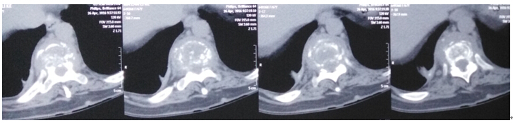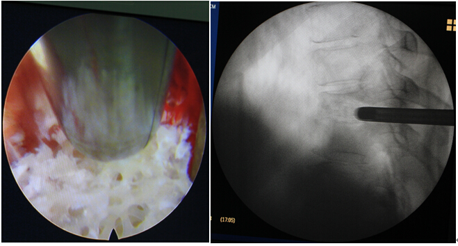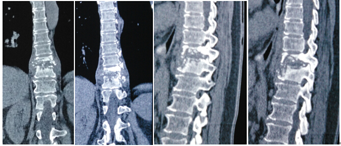 2016年4月29日我科应用椎间孔镜技术、经皮椎弓根螺钉技术成功治疗1例胸椎结核病例。患者女性,67岁,因“胸背部疼痛2月余,加重1月”就诊,经门诊就诊后积极抗结核治疗3周住院治疗。入院患者胸背部疼痛明显,CT示T10、T11椎体骨质破坏,T10塌陷。经科室讨论后应用经皮椎间孔镜技术经椎间孔入路行病灶清除、颗粒骨植骨,再经后路经皮椎弓根螺钉固定。手术顺利,无并发症,目前患者病情平稳。