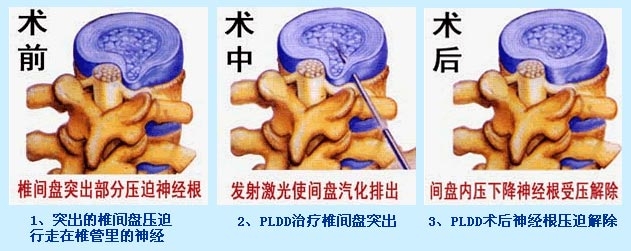 经皮激光椎间盘汽化减压术(PLDD,Percutaneous Laser Disc Decompression)是治疗颈、腰椎间盘突出的有效治疗方法。该方法是利用穿刺针穿刺椎间盘,将激光光导纤维引入至椎间盘内,利用激光能量气化消融部分髓核,降低椎间盘内压力,形成负压,使突出的髓核回缩,从而减轻或去除对神经的压迫、刺激,从而达到改善症状的治疗目的。该项微创治疗过程仅需半个小时左右,具有不出血、损伤小、恢复快、安全性高等特点。