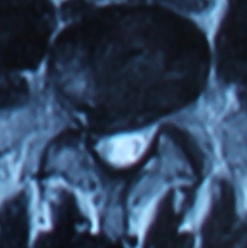 2. 患者董某,女,70岁,因“腰部疼痛并右下肢疼痛、麻木1年余,加重10天”入院。入院前曾多次行针灸、理疗、骶管封闭等治疗,经治疗后病情复发。入院见患者腰痛并右下肢疼痛,双足麻木,间歇性跛行,跛行距离约50米。查:直腿抬高试验右30°阳性,右踇背伸肌力、腓骨长短肌肌力Ⅲ级,双小腿外侧、足背皮肤感觉减退,右侧为甚。入院后诊断为腰椎间盘突出症。患者既往患高血压、冠心病、慢性胆囊炎、胆结石病史,形体肥胖。入院后完善检查,明确诊断,请相关科室会诊后认为手术风险大且患者形体肥胖,为手术增加难度,势必延长手术时间,增加手术风险。经科室讨论后行经皮椎间孔镜下髓核摘除,手术麻醉方式为局麻。入院后第三日手术,经椎间孔入路椎间孔镜下髓核摘除椎管扩大成形术。手术顺利,术中无出血,手术时间约1小时。术中可与患者交流。术后患者即可感右下肢无疼痛,第二天佩戴腰围下地活动后双下肢无不适。术后第三天出院,术后第三天复查腰椎MRI示突出髓核已摘除,神经根无受压。术后随访三月,患者目前病情恢复良好,无下肢疼痛。