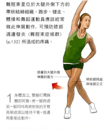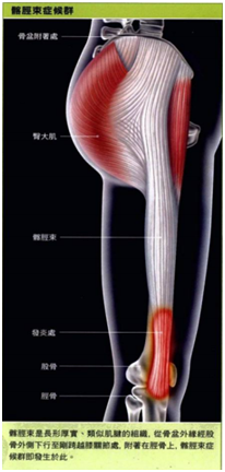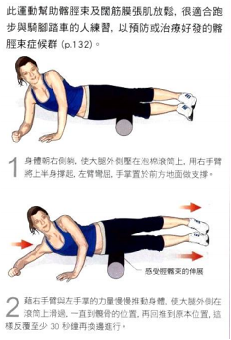 症状与诊断:初期膝盖外侧疼痛,特别是下楼梯时明显,跑步时可能使之加重,尤其是下坡,此外肌腱会肿胀、增厚,大腿外侧有紧绷感。膝盖弯曲或伸展时产生疼痛,髋外展时有无力感。一般可通过以上症状得出诊断,不过确诊可借助超声波或核磁共振。