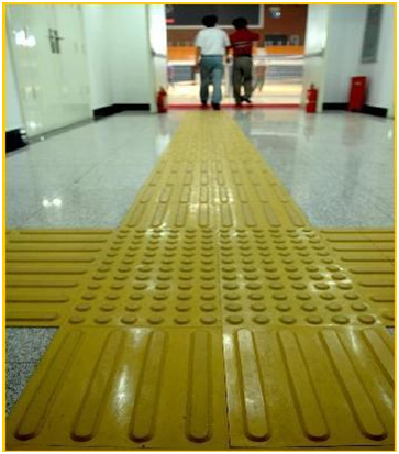盲道本是为盲人提供行路方便和安全的道路设施,盲道一般由两类铺就,一类是条形引导砖,引导盲人放心前行,称为行进盲道;一类是带有圆点的提示砖,提示盲人前面有障碍,该转弯了。盲道表面触感部分以下的厚度应与人行道砖一致。盲道触感条25mm,高度5mm。盲道应连续,中途不得有电线杆、拉线、树木、井盖铺设等障碍物。