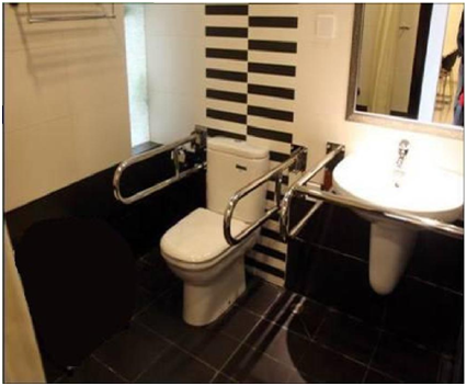一般面积≥2×2m。大便池一般采用坐式马桶,高0.40~0.45m,两侧安臵扶手,两侧扶手相距0.80m左右。若要供偏瘫患者应用,扶手也可采用可以移动的,移开一侧以便轮椅靠近。洗手池下部空间宽度应大于0.70m,深度大于0.40m,池底最低处不低于地面0.68m,以便乘轮椅患者的腿部能进入池底;洗手池台面高度不应高于地面0.78m,以便于接近水池以洗手和洗脸。