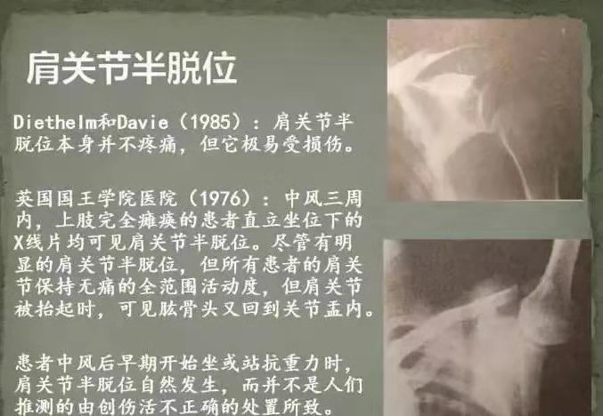 肩关节半脱位(又称不整齐肩)在偏瘫患者中很常见。表现为肱骨头在关节盂下滑,肩峰于肱骨头之间出现明显的凹陷。
