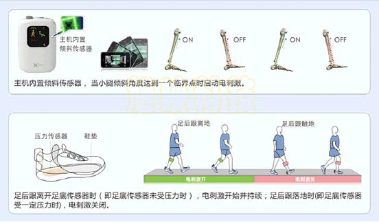 足下垂助行仪是一款先进的功能性电刺激(FES)设备,它对改善足下垂患者的步态有显著的效果。对于因卒中、非完全性脊髓损伤、脑外伤、多发性硬化症等中枢神经损伤而引起的足下垂患者都有帮助。足下垂助行仪由助行仪主机,足底传感器,电极片等组成。它采用了先进的传感器技术及智能算法,通过追踪患者步行时小腿前后摆动的位置角度和速度来控制电刺激的时机和持续时间。在行走过程中,该系统通过电刺激腓总神经及受腓总神经支配的胫骨前肌和其它肌肉,从而来控制足踝及脚产生背屈、外翻运动。这些温和的电脉冲刺激患腿的肌肉,使得患者的腿部在每步行过程中适时地抬起,让患者的步行更平稳,更自然及安全。