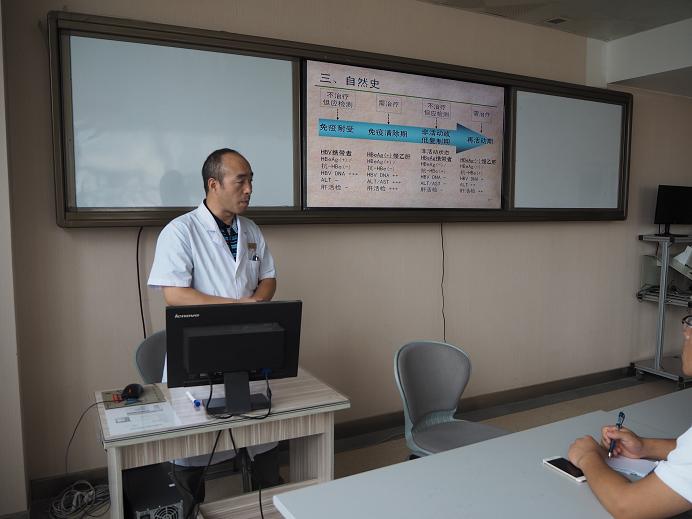 马国珍副主任医师就慢性乙型肝炎的病原学、流行病学、自然史、预防、临床诊断、实验室检查、影像学诊断、病理学诊断、中医对慢性病毒性肝炎治疗的认识等进行多媒体讲解。几位专家对本次教学查房进行点评,专家们认为本次教学查房科室准备认真、教学病例选择符合科室特色,具有教学意义,对存在的不足提出了改进的意见及建议。
