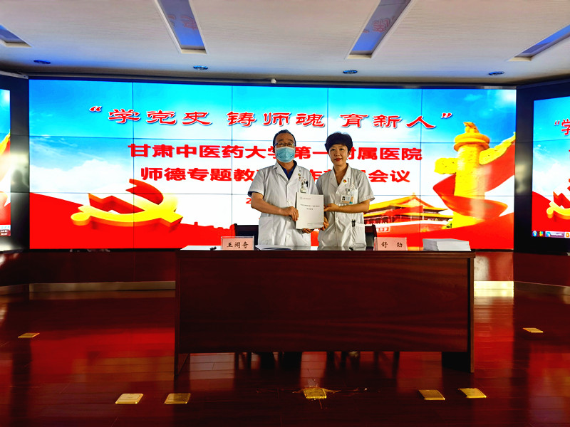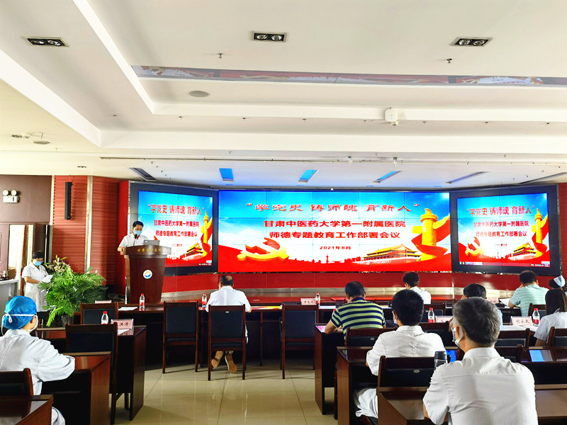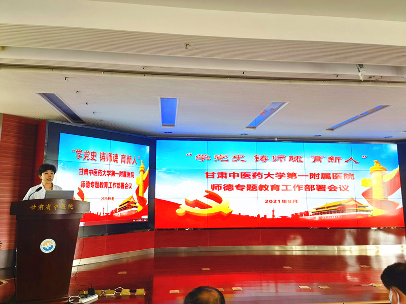 罗克龙宣读《中共甘肃中医药大学委员会关于印发<“学党史 铸师魂 育新人”师德专题教育实施方案>的通知》,妇科教研室主任张斌作为教师代表进行表态发言,他表示,作为临床带教老师,首先要坚持正确的价值导向,将社会主义核心价值观融入教学全过程;其次要坚持思想上认同,增进对中国特色社会主义的政治认同、思想认同、理论认同和情感认同,强调用传统文化、名医经典,引导启发和教育学生热爱祖国、热爱人民、热爱中国共产党的领导;另外还要加强自身建设,提高道德修养,争做“四有”好老师。