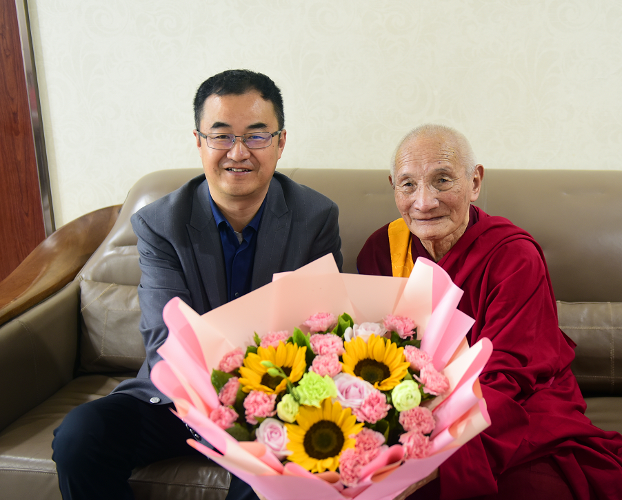 5月18日,院党委书记郭峰前往国际医疗部探望在我院接受保健医疗的全国政协委员、十一世班禅经师加羊加措高僧,为其送上鲜花,祝福健康长寿。加羊加措对医务人员的精心治疗与悉心护理表示真诚感谢,同时为医院赠送一樽鎏金药师佛像,祝愿省中医院各项事业蓬勃发展,希望广大医务人员秉承卫生职业精神,弘扬中医药传统文化,为保障人民健康做出更大贡献。医院有关部门负责同志陪同探望。