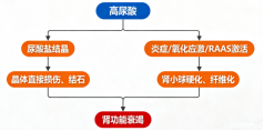 2.间接损害(激活RAAS系统与炎症):即使没有形成结晶,高水平的尿酸本身也会激活肾脏内的肾素-血管紧张素-醛固酮系统(RAAS),引起肾小球内高压、血管收缩和氧化应激。这就像让肾脏长期在“高压”和“发炎”的状态下工作,最终导致肾小球硬化和间质纤维化,肾功能逐步丧失。