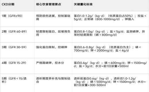 肾病患者的饮食方案需进行个体化调整,如慢性肾脏病患者肾功能分期的饮食要点: