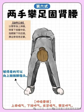 两手攀足固肾腰:通过身体前屈、双手攀足的动作,拉伸腰部经络,刺激肾俞穴、命门穴等肾经要穴,起到固肾强腰的作用,改善肾虚引起的腰膝酸软、乏力等症状。