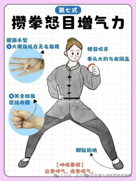 攒拳怒目增气力:通过握拳发力、怒目圆睁的动作,调动全身气机,增强脏腑功能,同时疏通肝气(肝木克脾土,肝气调畅则脾运化正常,脾为肾之母,脾健则肾充),间接起到养肾作用。