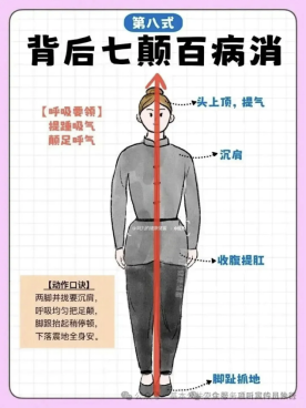 背后七颠百病消:通过脚跟提起、轻轻下落的颠动,刺激足底肾经涌泉穴,同时震动全身脏腑,促进气血循环,帮助排出代谢废物,缓解身体疲劳。练习时应动作缓慢柔和,呼吸自然均匀,避免憋气发力,练习后以身体微微发热、无疲劳感为宜。