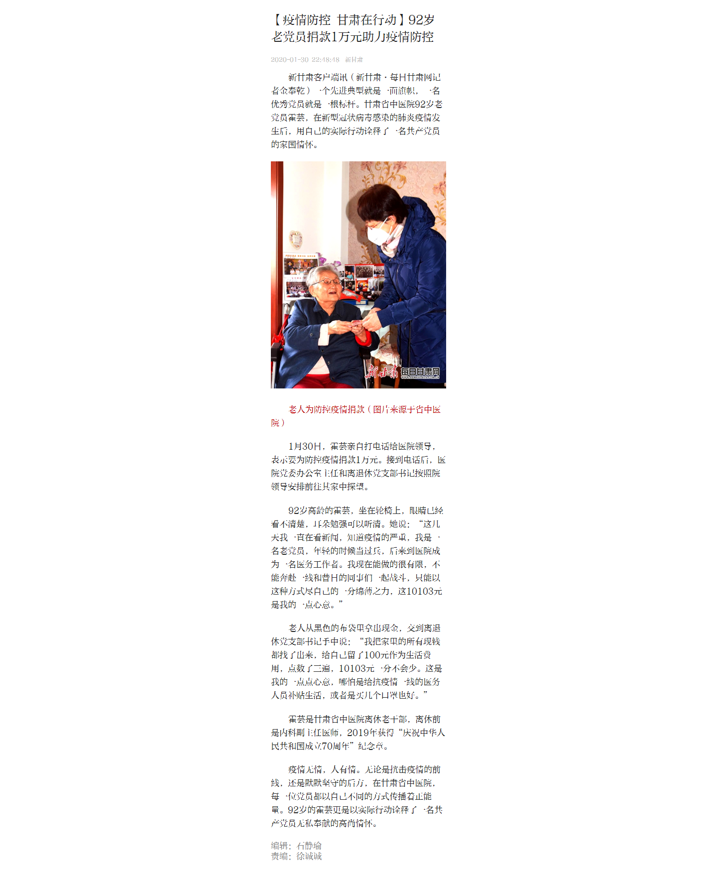新甘肃:92岁老党员捐款1万元助力疫情防控
