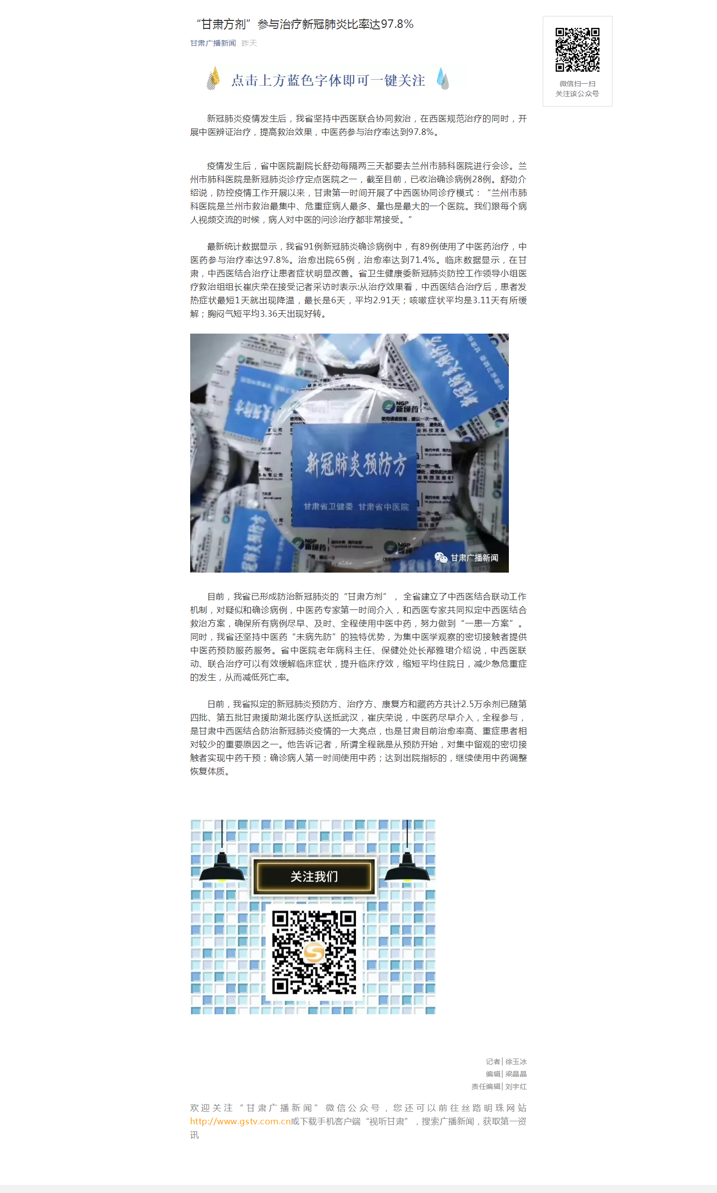 甘肃广播新闻:“甘肃方剂”参与治疗新冠肺炎比率达97.8%