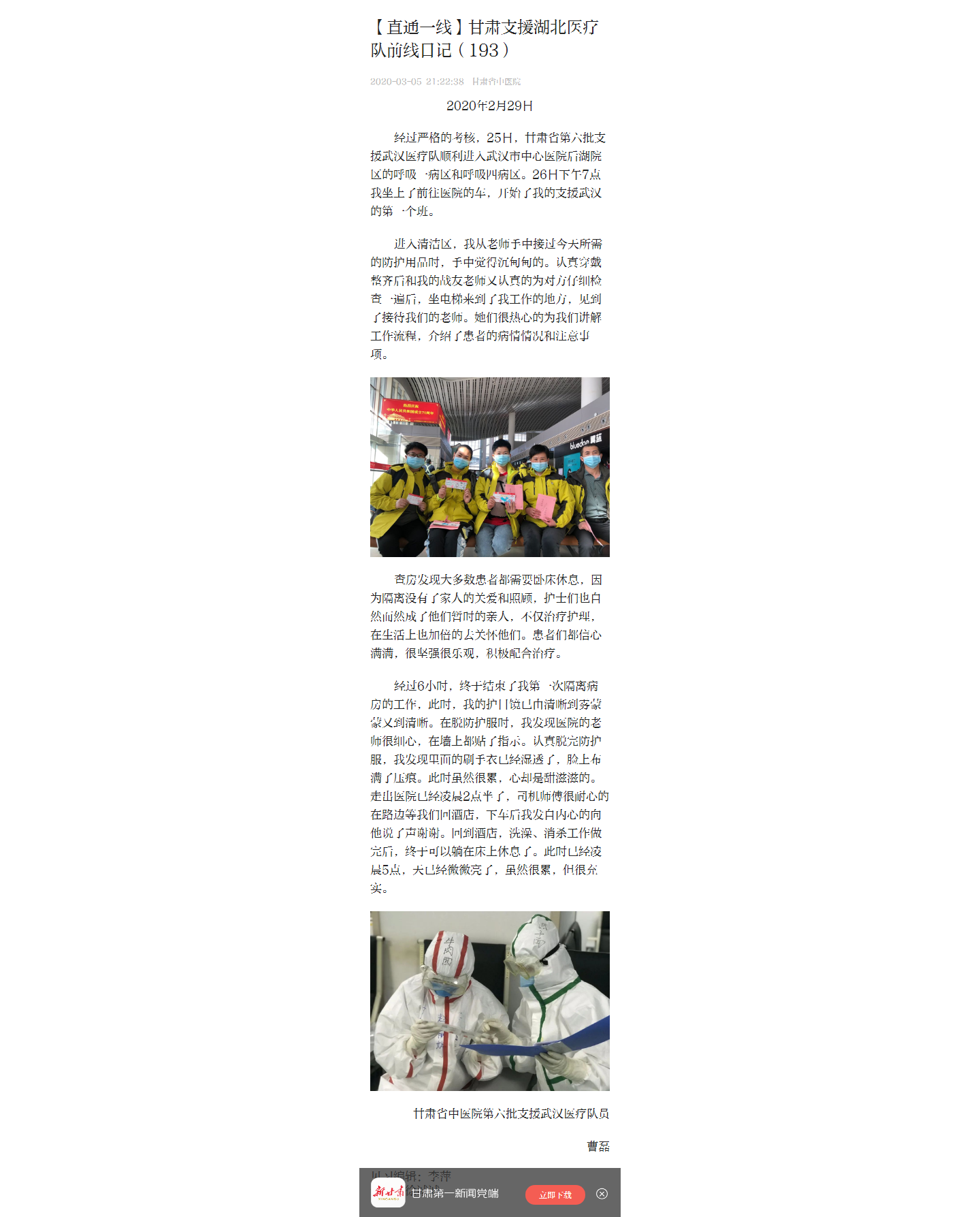 新甘肃:甘肃支援湖北医疗队前线日记(193)曹磊