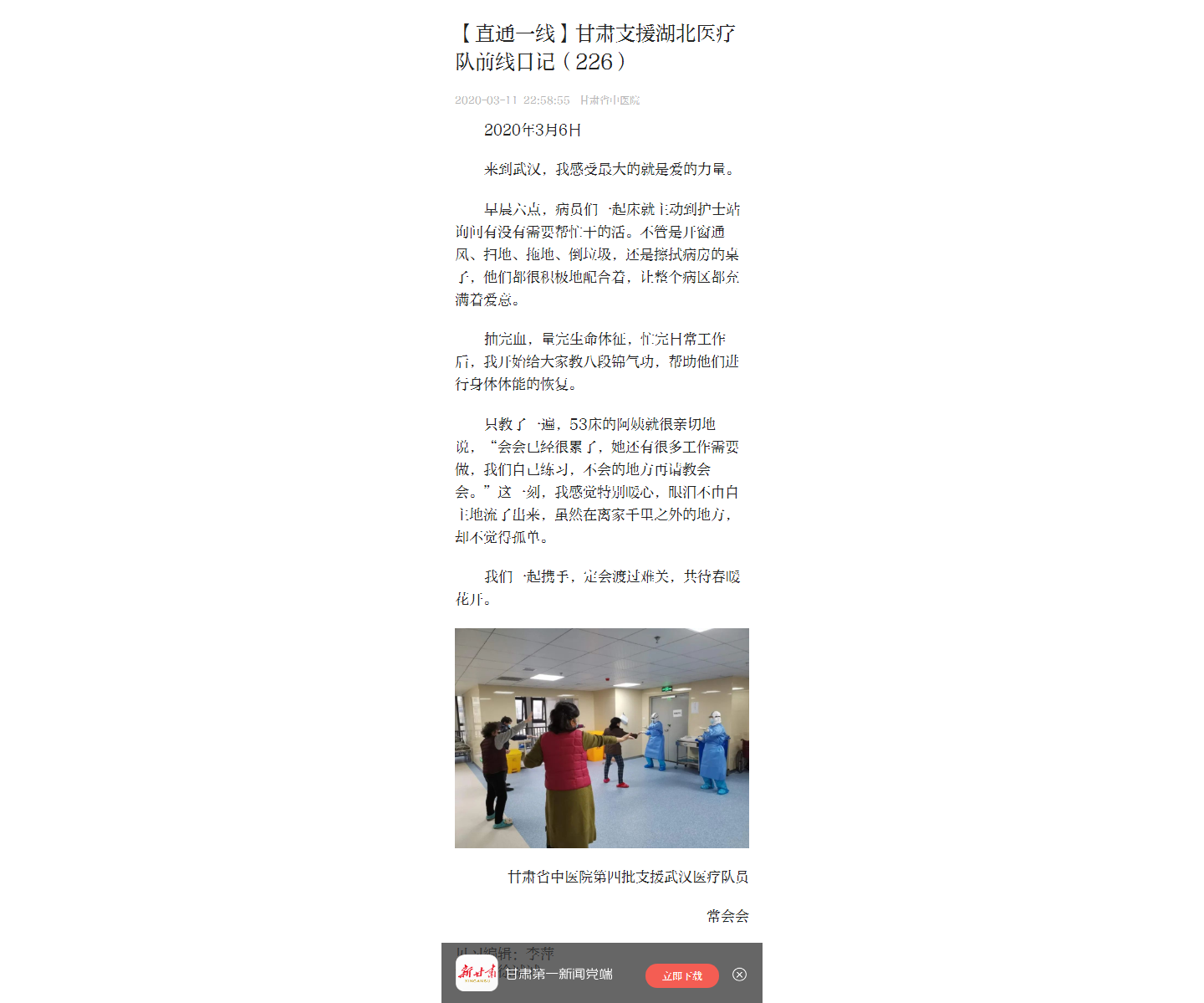 新甘肃:甘肃支援湖北医疗队前线日记(226)常会会